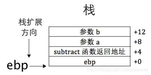 1 push ebp   ;备份ebp,为以后用ebp做为基址来寻址参数2 mov ebp, esp  ;将当前栈顶赋值给ebp3 mov eax, [ebp+8] ;得到被减数,参数a4 sub eax,[ebp+12] ;得到减数,参数b5 pop ebp    ;恢复ebp的值