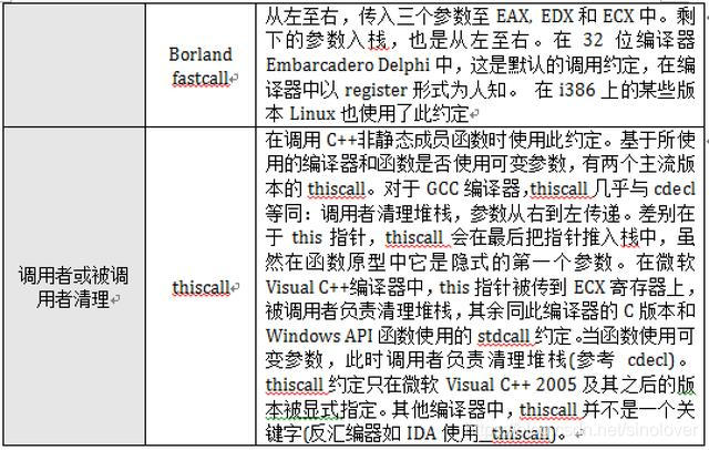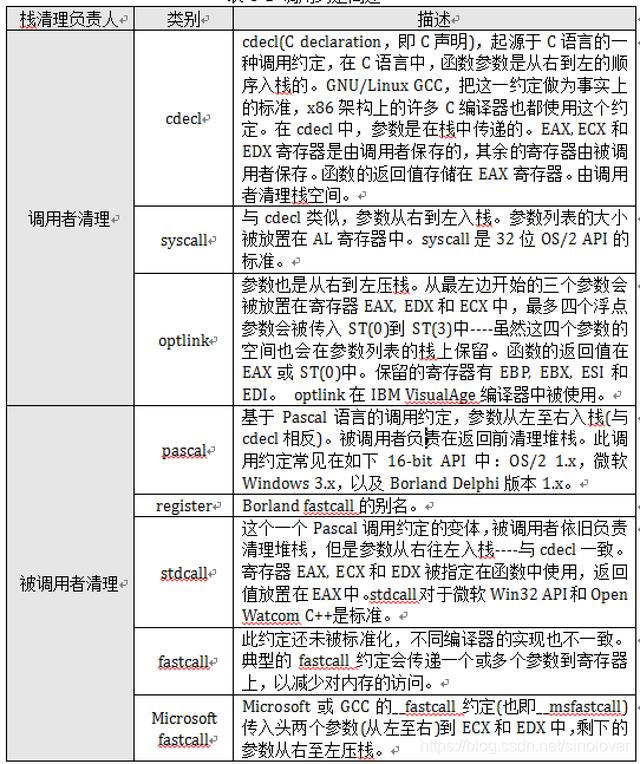 在高级语言中,这两个问题是通过调用约定来解决的,调用约定就是调用方和被调用方就以上问题达成一致解决方案的约定,双方按照这种约定合作就不会发生问题。我们按照由谁来清理栈空间分类,目前的调用约定见表1